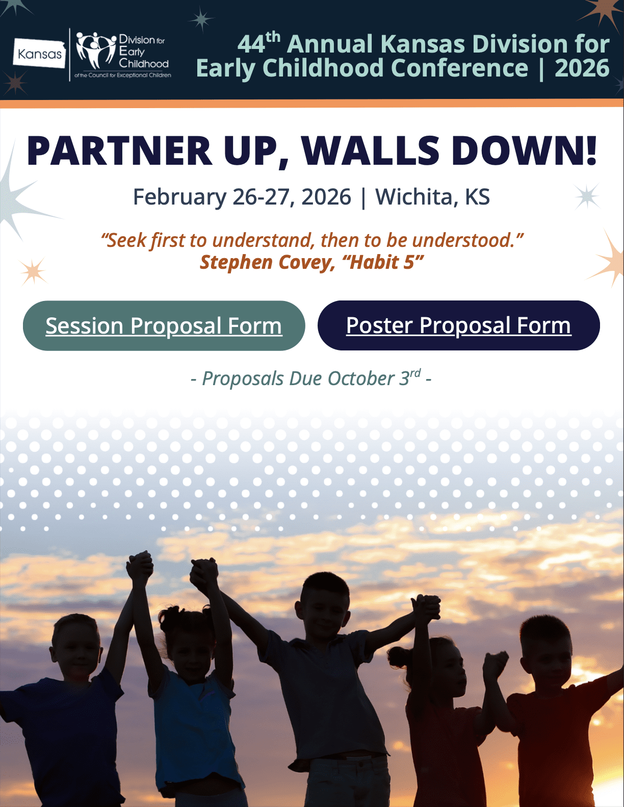 The deadline for Proposals has been extended to the end of day October 11th. Submit your proposal for The 43rd Annual Kansas Division for Early Childhood Conference by clicking the link below. The conference will be held February 27 – February 28th, 2025 at the DoubleTree by Hilton Hotel Wichita Airport in Wichita, Kansas.